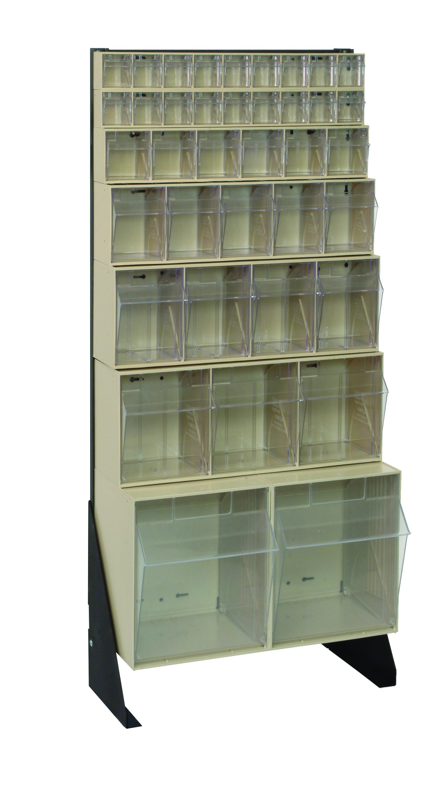 Tip Out Bin Floor Stand, single sided, 10″D x 23-5/8″W x 52″H, includes: (1) QTB302, (1) QTB303, (1) QTB304, (1) QTB305, (1) QTB306 and (2) QTB309 ivory bins, 14 gauge steel, black coated finish