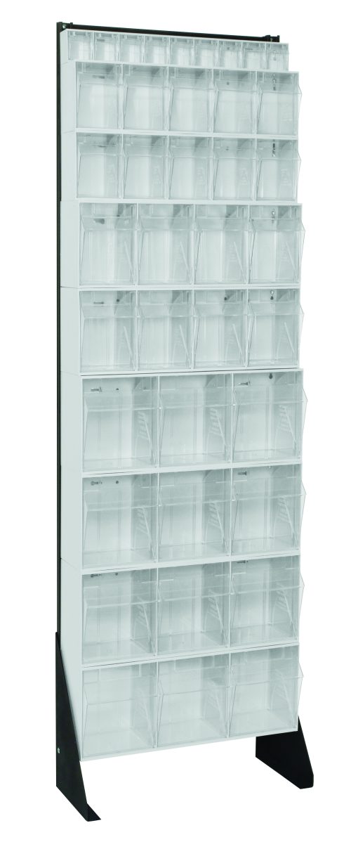 Tip Out Bin Floor Stand, single sided, 10″D x 23-5/8″W x 75″H, includes: (4) QTB303, (2) QTB304, (2) QTB305 and (1) QTB306 white bins, 14 gauge steel, black coated finish
