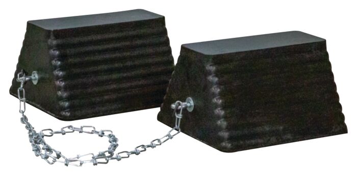 WHEEL CHOCK, GENERAL PURPOSE, RUBBER, 11.5″ X 10″ X 7.25″,RIBBED,PYRAMID, EYEBOLT,CHAINED PAIR,BLACK