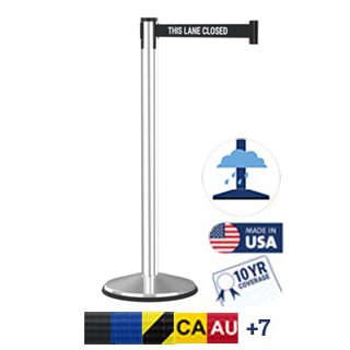 This Outdoor Retractable Belt Barrier, by Visiontron®, features the highest quality available for medium traffic crowd control barriers. Outdoor weather resistance is due to using aircraft grade aluminum posts with zinc painted cast iron bases. Manufactured in the USA with the highest quality materials that will prove to stay safe and durable for decades. It’s thick and durable 10′ belt is over 30% longer then most competitively priced line posts, resulting in fewer stanchions to buy, ship, and store. These posts are recommended for outdoor use.