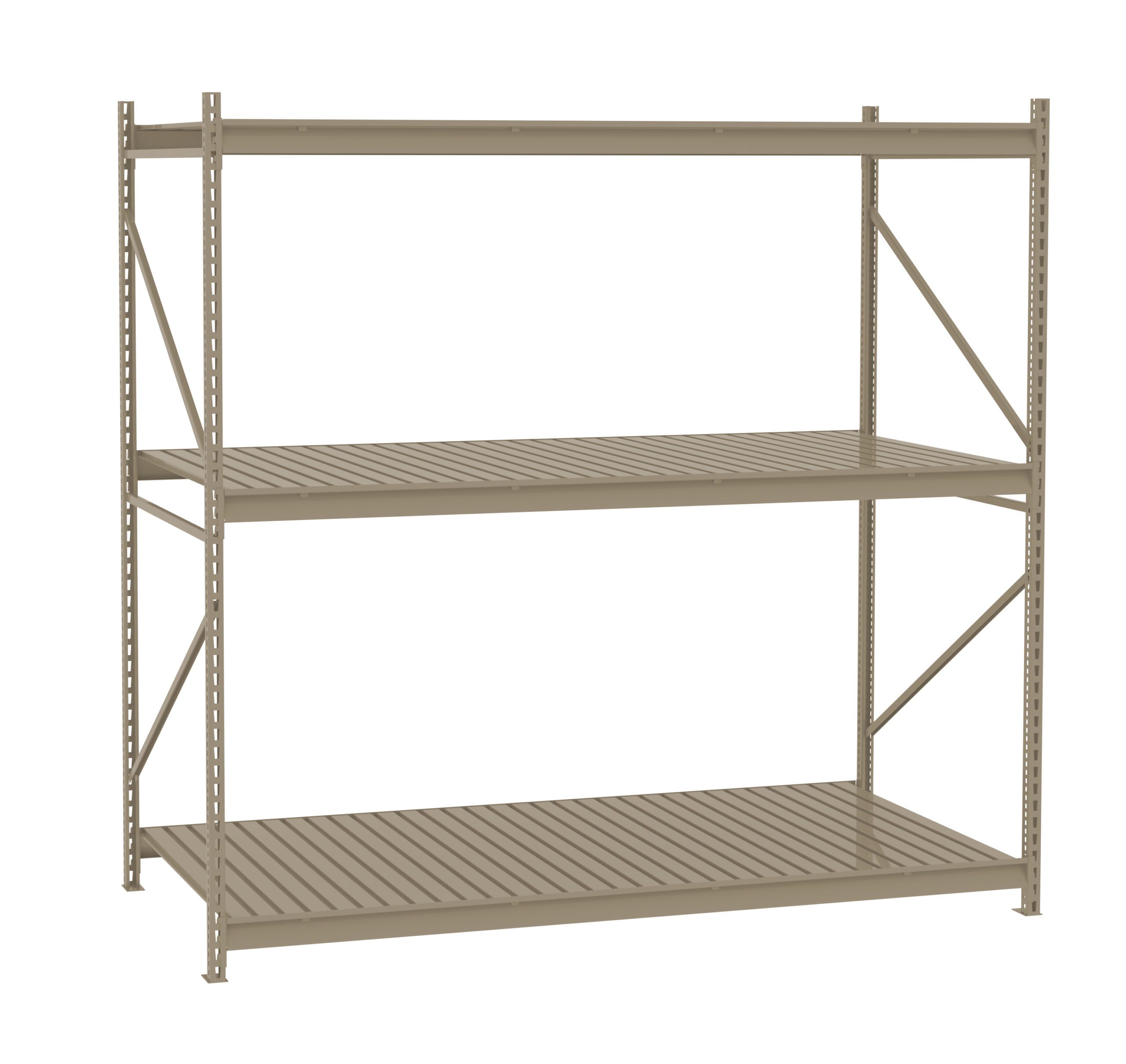 Bulk storage units go together fast and easy. Beams simply slide into place. Superior beams lock into the uprights on 2” centers. Specially formed beams add strength at the front and rear of shelf edges. All corrugated decking comes in 12” wide sections.