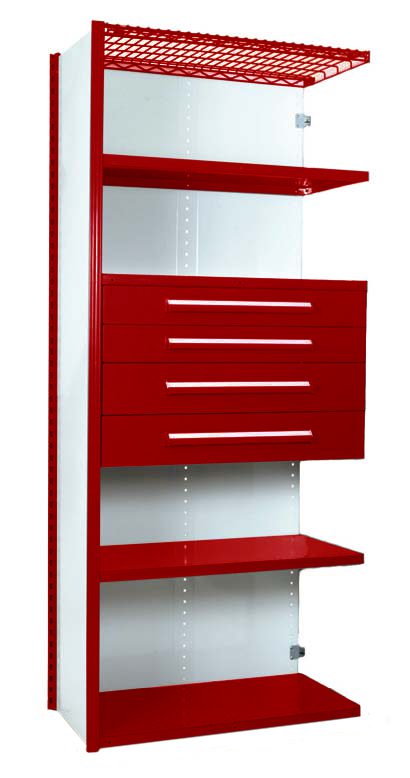 V Grip Shelving with Drawers — V-Grip Shelving with Drawers – 18 Gauge Design Benefits and Features include: industry leader in structural integrity; combine the best of drawer and shelving storage in one unit, bulk storage space for larger items is available on shelving over and below drawers for small parts stored ergonomically in the “Gold Zone” between shoulders and knees for easy access. 100% drawer extension provides full drawer access, 200 lbs. (36″ width) and 400 lbs. (36″ and 48″ width) capacities available. Exclusive v-grip compression design, durable enamel paint finish, available in open and closed(Back and sides) configurations. Regardless of color selected for shelving, all side and back panels are reflective white to enhance visibility.Equipto V-Grip Shelving with Drawers Unit – 4 Drawers/5 Shelves 7×1.5×3 Closed Addon, 3″, 4.5″, 6″, 7.5″ Drawers
