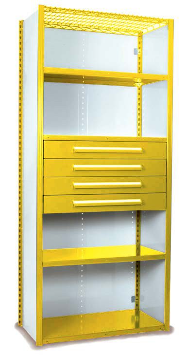 V Grip Shelving with Drawers — V-Grip Shelving with Drawers – 18 Gauge Design Benefits and Features include: industry leader in structural integrity; combine the best of drawer and shelving storage in one unit, bulk storage space for larger items is available on shelving over and below drawers for small parts stored ergonomically in the “Gold Zone” between shoulders and knees for easy access. 100% drawer extension provides full drawer access, 200 lbs. (36″ width) and 400 lbs. (36″ and 48″ width) capacities available. Exclusive v-grip compression design, durable enamel paint finish, available in open and closed(Back and sides) configurations. Regardless of color selected for shelving, all side and back panels are reflective white to enhance visibility.Equipto V-Grip Shelving with Drawers Unit – 4 Drawers/5 Shelves 7x2x3 Closed Starter, (4)4.5″Drawers