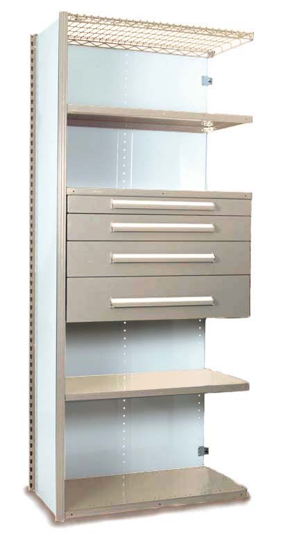 V Grip Shelving with Drawers — V-Grip Shelving with Drawers – 18 Gauge Design Benefits and Features include: industry leader in structural integrity; combine the best of drawer and shelving storage in one unit, bulk storage space for larger items is available on shelving over and below drawers for small parts stored ergonomically in the “Gold Zone” between shoulders and knees for easy access. 100% drawer extension provides full drawer access, 200 lbs. (36″ width) and 400 lbs. (36″ and 48″ width) capacities available. Exclusive v-grip compression design, durable enamel paint finish, available in open and closed(Back and sides) configurations. Regardless of color selected for shelving, all side and back panels are reflective white to enhance visibility.Equipto V-Grip Shelving with Drawers Unit – 4 Drawers/5 Shelves 7×1.5×4 Closed Add-On, 4.5″ & 6″ Drawers