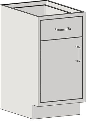 Base unit, sitting height, left-hand hinged door with wire style pull, (1) 6″ drawer with wire style pull, 22”D x 24”W x 29-1/8”H, stainless steel construction with adjustable intermediate shelf & removable back