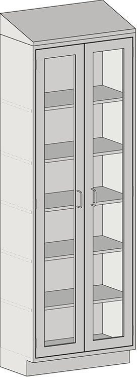 Tall Cabinet, closed front, sloped top, 24″D x 36″W x 89″H, two hinged doors with tempered glass inserts and wire style pulls, stainless steel construction, (5) adjustable intermediate shelves
