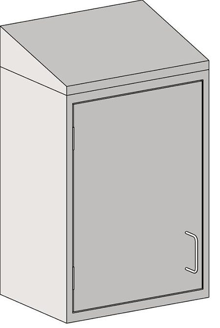 Wall cabinet, closed front, sloped top, 13″D x 18″W x 36″H, left-hand hinged door with wire style pull, stainless steel construction, (2) adjustable intermediate shelves