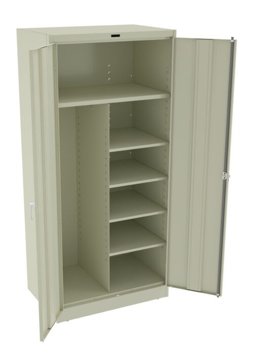 16-gauge fully welded frame and heavy duty construction provides superior sturdiness and increased strength over our standard cabinets. Doors incorporate an extra wide reinforcement that is welded for added strength and stability. Two adjustable levelers compensate for uneven floors. Two brushed chrome handles. Right handle uses three-point keyed locking to secure both doors. Four-knuckle hinges for added durability. Louvered back panel provides cabinet ventilation. Shelves adjust in 2″ increments without tools. Integrated shelf support tabs secure shelves tightly to cabinet without clips or added parts. Raised base keeps contents out of harm’s way from cleaning liquids.