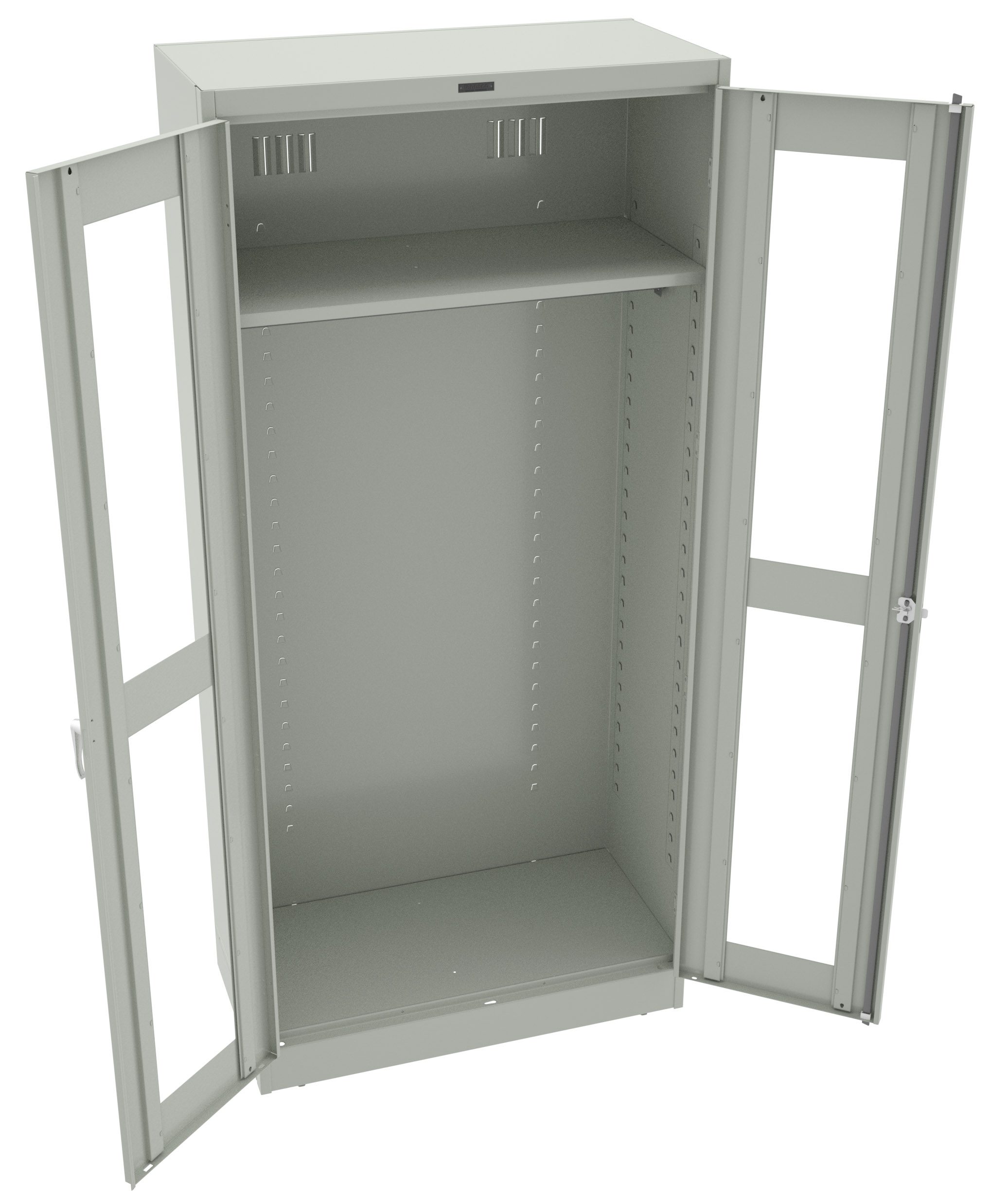 C-Thru doors provide the perfect solution for viewing contents of cabinets while restricting access. 16-gauge fully welded frame and heavy duty construction provides superior sturdiness and increased strength over our standard cabinets. Two adjustable levelers compensate for uneven floors. Two brushed chrome handles. Right handle uses three-point keyed locking to secure both doors. Four-knuckle hinges for added durability. Louvered back panel provides cabinet ventilation. Shelves adjust in 2″ increments without tools. Integrated shelf support tabs secure shelves tightly to cabinet without clips or added parts. Raised base keeps contents out of harm’s way from cleaning liquids.