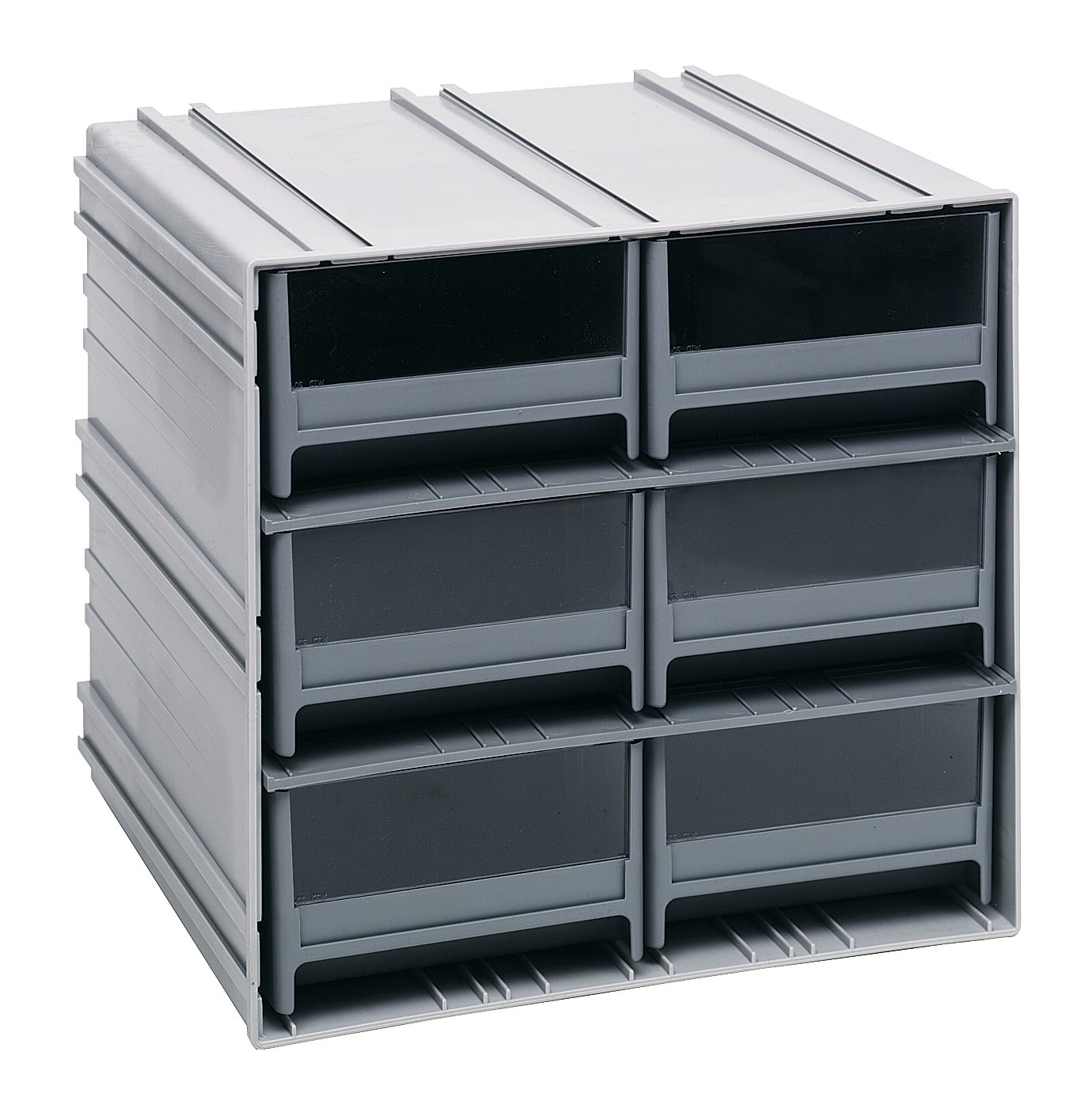 Interlocking Storage Cabinets, 11-3/8″D x 11-3/4″W x 11″H, includes: (6) IDR204, windows and (2) dividers per drawer, cabinets interlock horizontally and vertically or can be mounted on wall, gray drawers, exterior cabinet available in gray only, Made in USA