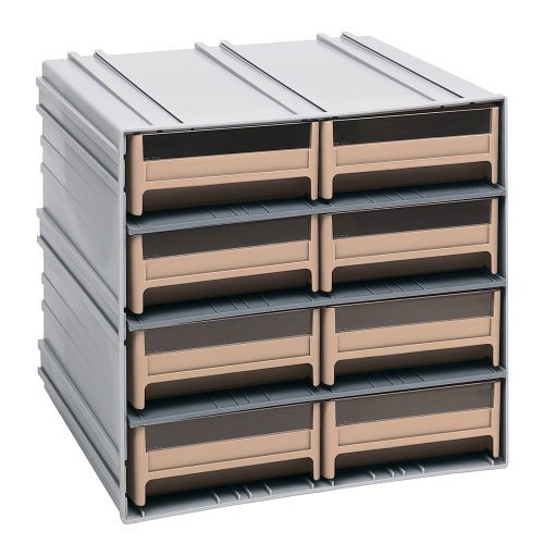 Quantum Interlocking Storage Cabinets, 11-3/8″D X 11-3/4″W X 11″H, Includes: (8) IDR203, Windows And (2) Dividers Per Drawer, Cabinets Interlock Horizontally And Vertically Or Can Be Mounted On Wall, Ivory Drawers, Exterior Cabinet Available In Gray Only, Made In USA