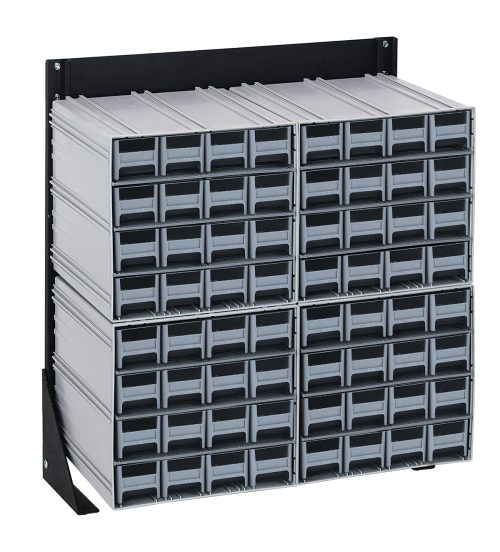 Interlocking Storage Cabinets Floor Stand, single sided, 12″D x 23-5/8″W x 28″H, 300 lbs. load capacity, includes: (4) QIC-161, (64) gray drawers, 14 gauge steel, black coated finish