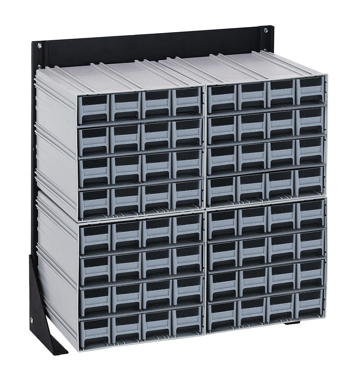 -58%Interlocking Storage Cabinets Floor Stand, single sided, 12″D x 23-5/8″W x 28″H, 300 lbs. load capacity, includes: (4) QIC-161, (64) gray drawers, 14 gauge steel, black coated finish