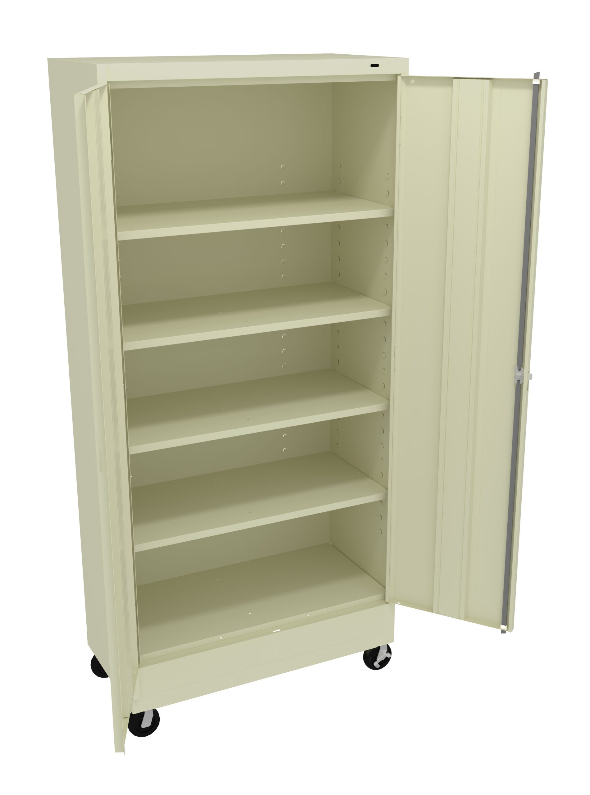 A tall, beige metal storage cabinet with one door open. It has five adjustable shelves inside and is mounted on wheels for mobility. The cabinet is empty, showcasing its storage capacity.