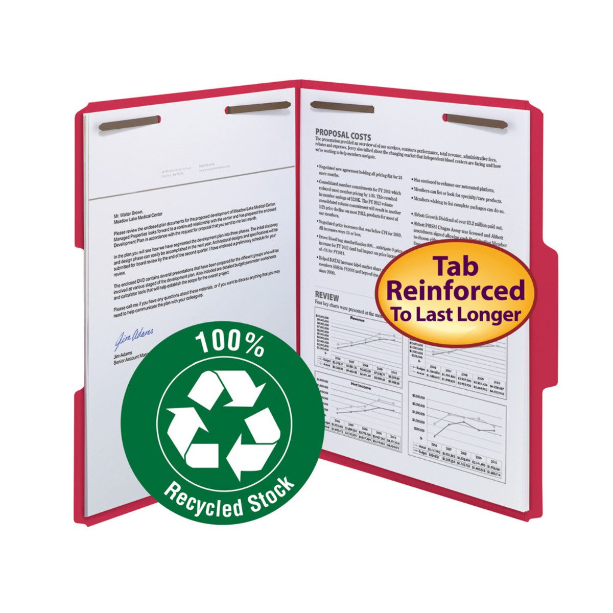 Smead 100% Recycled Fastener File Folder, 2 Fasteners, Reinforced 1/3-Cut Tab, Letter Size, Red, 50 per Box (12741)
