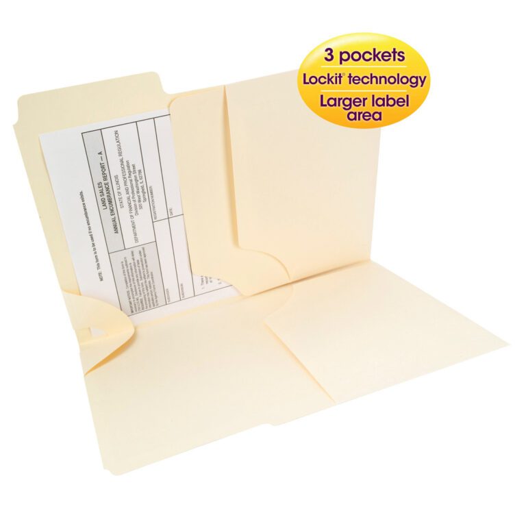 These 3-in-1 SuperTab? section folders with Lockit? technology allow you to securely subdivide multiple documents within a single file folder. Three extra high interior pockets safely hold documents, photos and certificates for secure transport while keeping the materials readily accessible. The patented Lockit flap folds over to secure your important documents and prevent them from falling out. The labeling area is 90% larger than standard file folders, so you can use larger text or more lines of description.