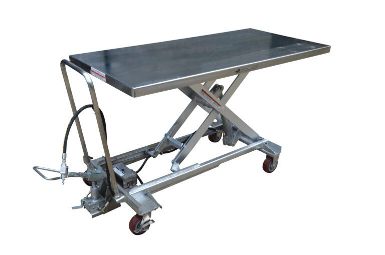 The Air Hydraulic Cart features a two speed foot pump and hand held reciprocating air/oil power to raise the platform. It utilizes the two speed foot pump for minor height adjustments and the factory air/oil power for effortless lifting. The platform, frame, handle, caster rigs, and hardware are all stainless steel. Pump assembly, hydraulic cylinder, and scissor legs are zinc plated.