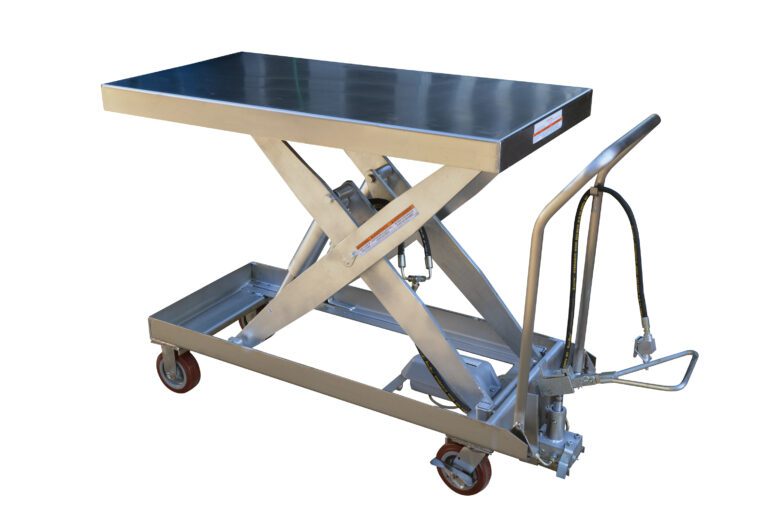 The Air Hydraulic Cart features a two speed foot pump and hand held reciprocating air/oil power to raise the platform. It utilizes the two speed foot pump for minor height adjustments and the factory air/oil power for effortless lifting.
