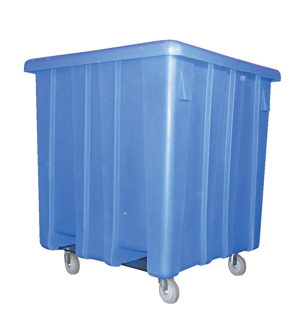 This rugged Bulk Container maximizes shipping, handling and storage efficiencies. This container will stack three high and accommodate solid, pourable, granular, and non-regulated material. Molded nesting “lugs” or “ribs” prevent units from jamming together. Rolls around smoothly on swivel casters.