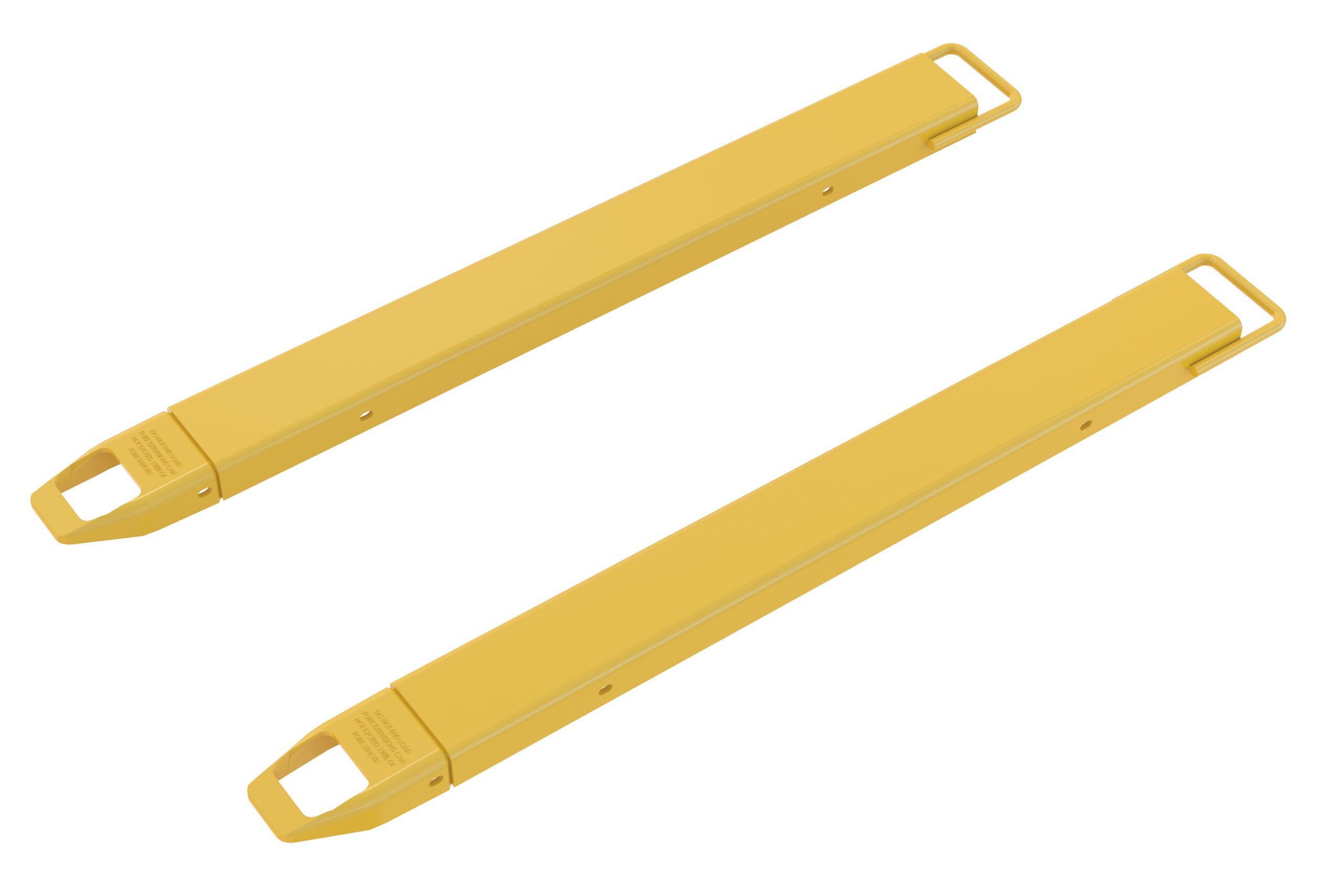 Provide the extra support needed to lift long or large objects with a fork truck using a pair of Fork Extensions. Welded steel construction with cast steel tips. Steel retaining strap prevents fork extensions from sliding off forks during use. Powder coat yellow finish. OSHA regulations require that extensions are no more than one-hundred and fifty (150) percent of the existing fork length. Insert loop at the tip of the fork and slide it up at a forty-five (45) degree angle. Then, lay it down over the existing fork. To be used with Class 2 and Class 3 forks only.