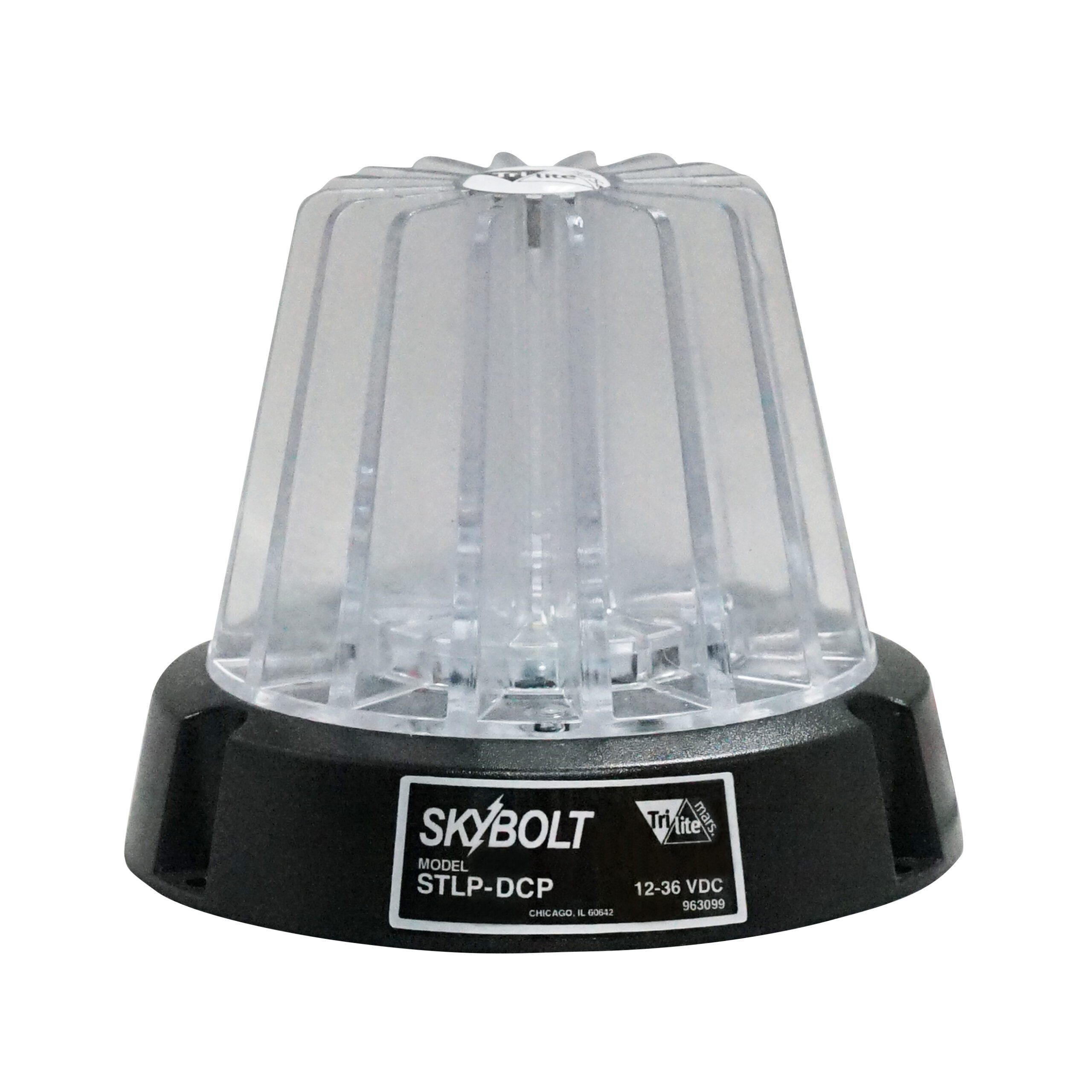 The Vestil Light, a clear round 4 dome with a black base, marked Skybolt, Tri-lite, and model STLP-DCP, is designed for dynamic environments and operates at 12-36 VDC, hinting at industrial or emergency use.