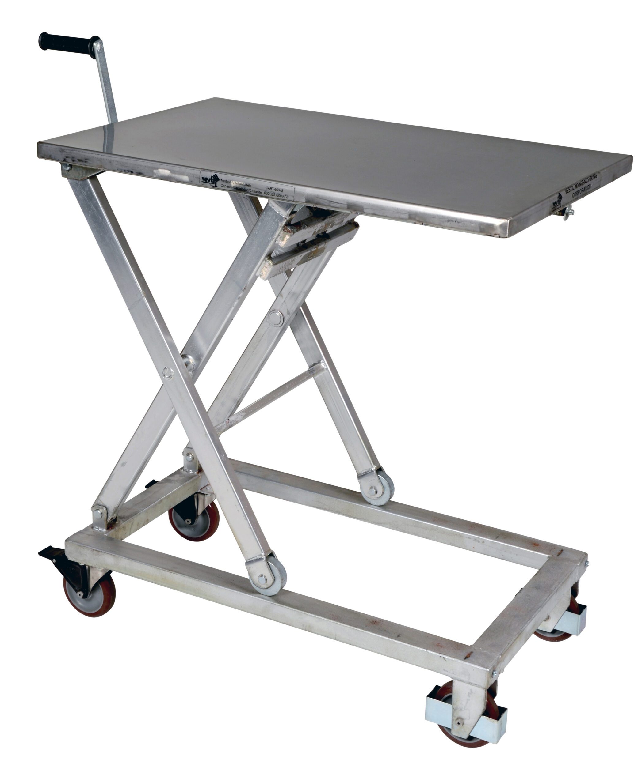 The Mechanical Scissor Cart raises and lowers material quickly and easily. The cart rolls smoothly on two rigid and two swivel casters. Mechanical screw drive provides precise positioning with no downward drift. The platform, frame, handle, caster rigs, and hardware are stainless steel. The crank assembly and scissor legs are zinc-plated/painted. The wheels are poly-on-poly. Features an internal safety velocity fuse in each cylinder.