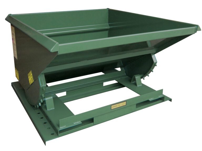 All welded Steel Self-Dumping Hopper handles bulk materials and scrap easily. Must transport and dump with a forklift or make the unit mobile with the optional casters. Self dumping hoppers are engineered to dump when the safety latch is tripped and to return to an upright locked position when empty. This Hopper comes with a trip rope assembly and has a formed stackable base. The included safety restraint should be properly secured to a fork truck before dumping. Standard paint finish is vista green.
