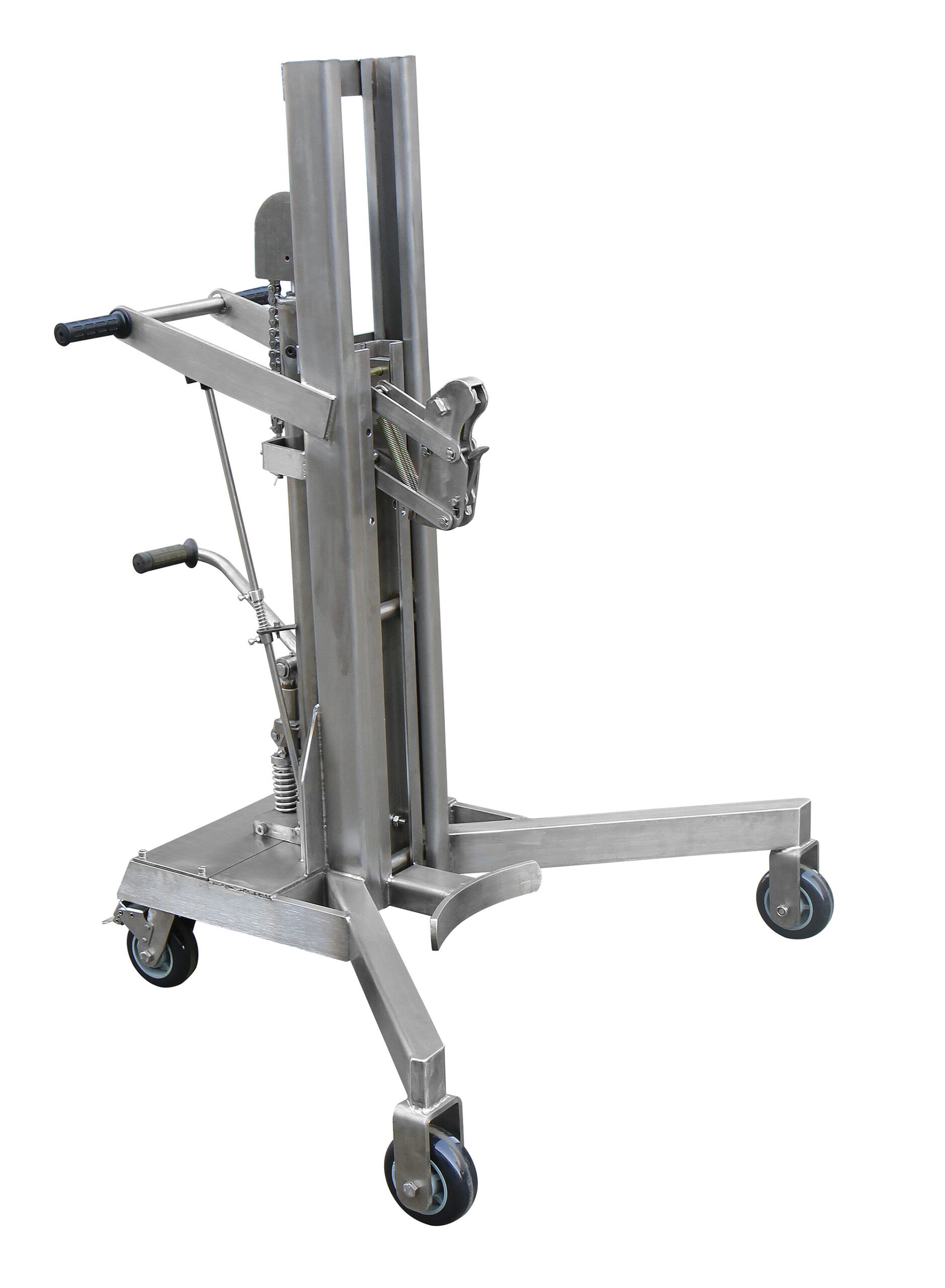 The Stainless steel hydraulic drum lifter is designed to allow the operator to load or unload drums on and off the corner of pallets. Straddle leg design allows the drum lifter to glide over standard pallets and grab most 30, 55, or 85 gallon steel and poly drums. Drums are raised and lowered easily using the foot pump. 304 grade all stainless steel construction. Ideal for wash-down, pharmaceutical, and clean room applications. Highly maneuverable on two (2) rigid and two (2) swivel with brake nylon wheels.