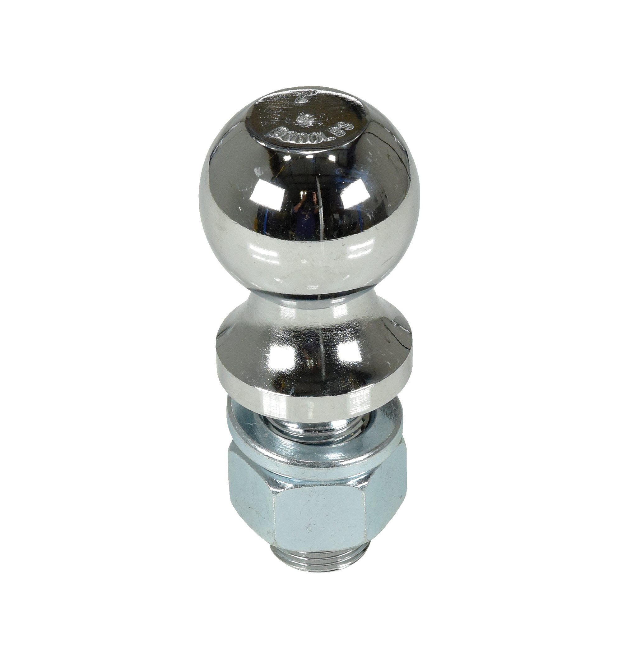 The Vestil Tow Attachment 5K Lb Cap 2 In Diameter includes a metallic trailer hitch ball with a shiny, spherical top. It offers a 5K lb capacity and 2-inch diameter, with a threaded bolt and large nut for secure towing, plus a reflective surface for enhanced visibility.