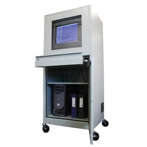 Monitor and computer eqiuipment accessed through full length door at back of cabinet, offering better protection in harsh environments