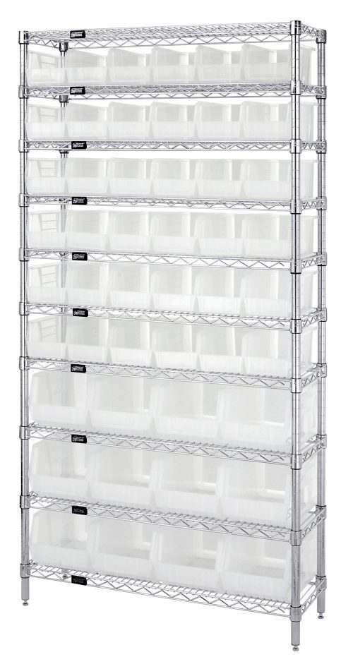 Quantum Bin System Unit, Stationary, Includes: (4) 74″H Posts, (10) 36″W X 14″D Wire Shelves, (36) QUS230 And (12) QUS240 Clear Bins, Chrome Plated Finish, Shipped Kd