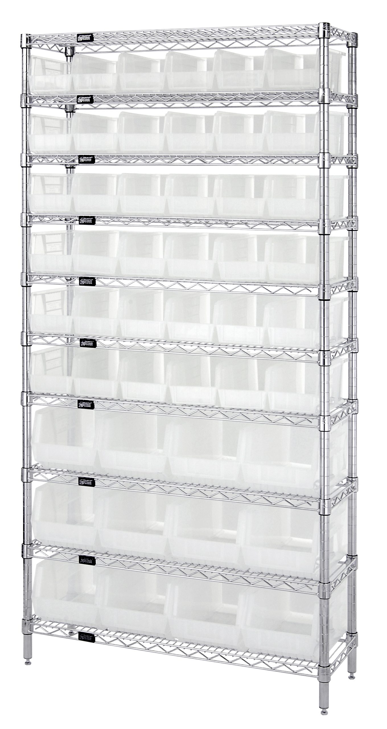 -58%Bin System Unit, stationary, includes: (4) 74″H posts, (10) 36″W x 14″D wire shelves, (36) QUS230 and (12) QUS240 clear bins, chrome plated finish, shipped KD