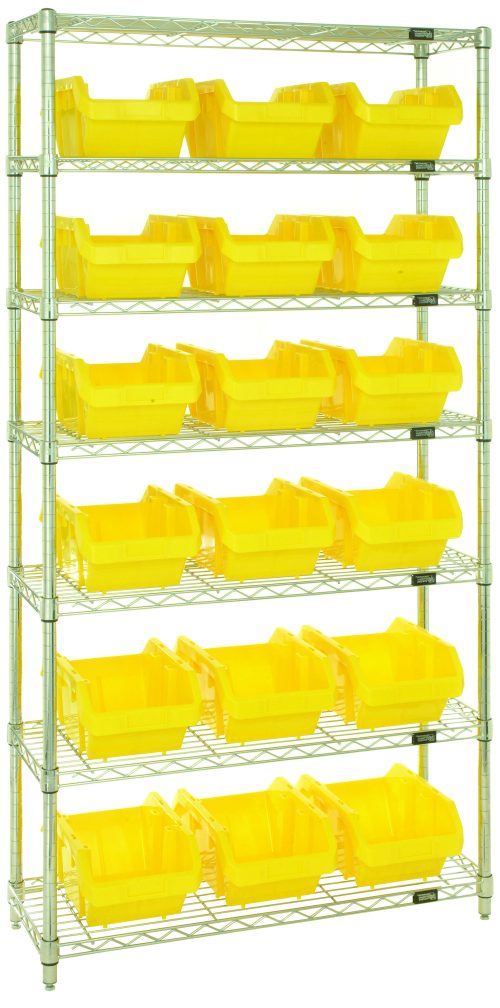 Quantum Bin System Unit, Stationary, Includes: (4) Posts, (7) Wire Shelves And (18) 14″L X 8-1/4″W X 6-1/2″H Yellow Bins (Qp1496), Chrome Plated Finish, Suitable For Dry Storage Applications, Shipped Kd