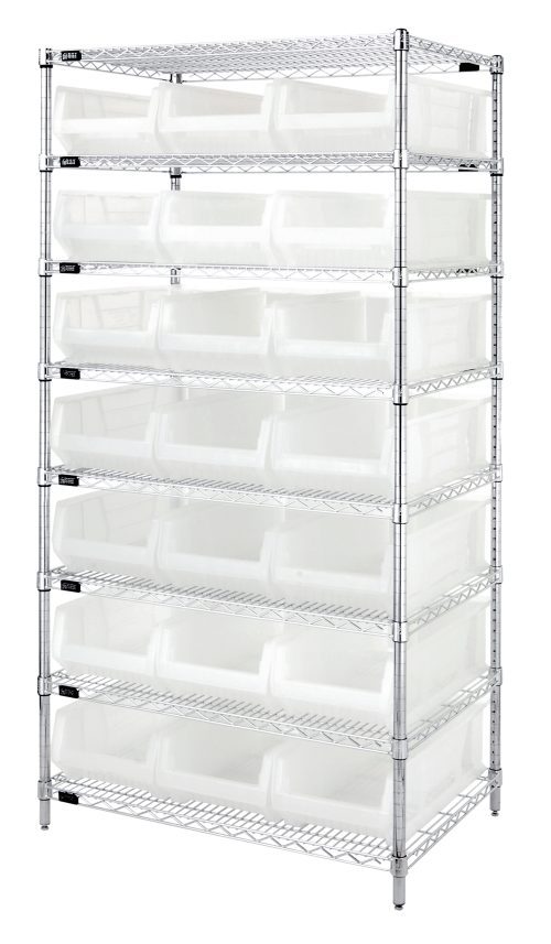 Quantum Bin Systems Unit, Stationary, Includes: (4) Posts, (8) Wire Shelves & (21) 23-7/8″L X 11″W X 7″H Clear Bins (QUS952), Chrome Plated Finish, Suitable For Dry Storage Applications, Shipped Kd