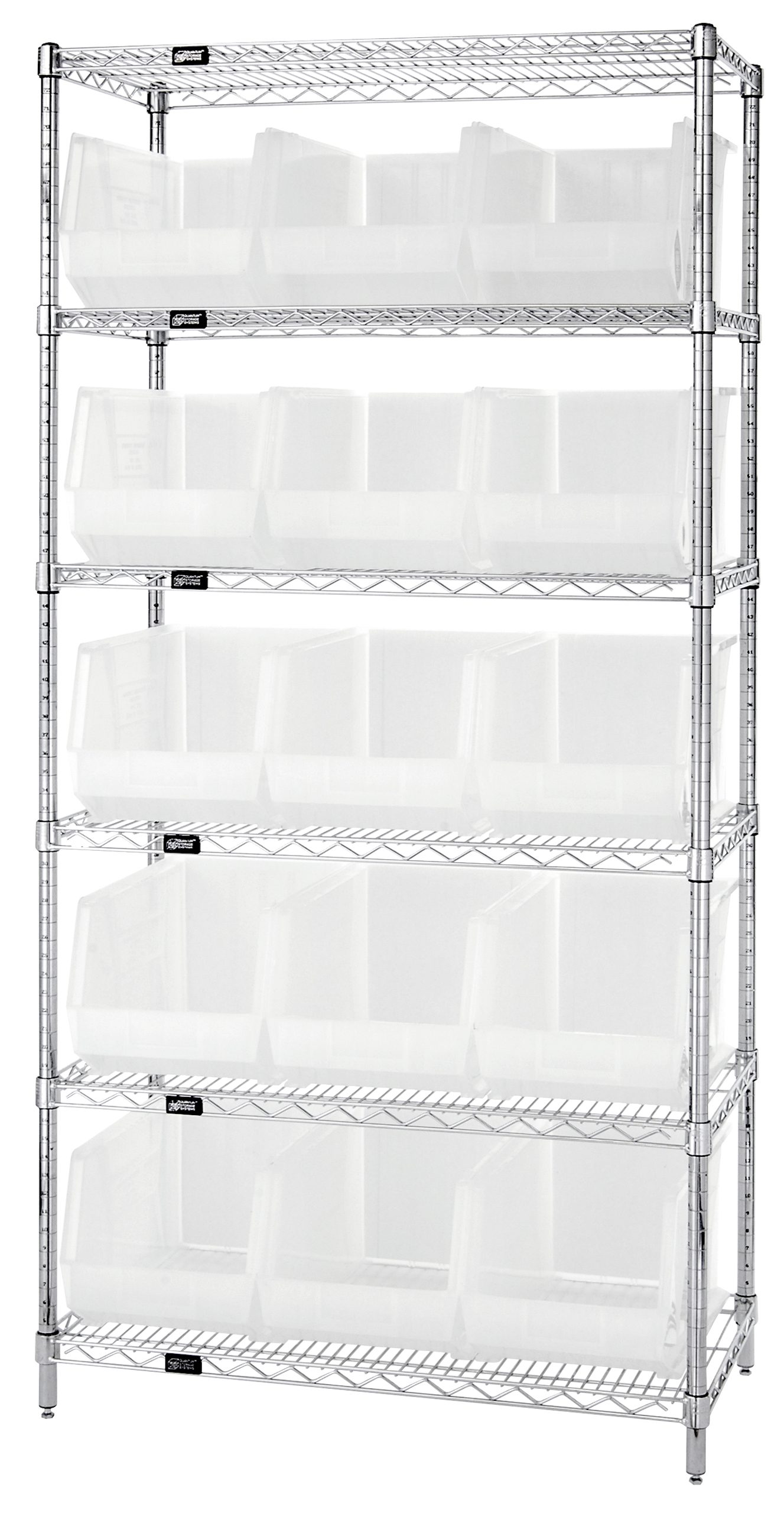 Bin Wire Shelving System, 36″L x 18″D x 74″H, 800 lbs load capacity per shelf, includes: (6) shelves and (15) QUS260 clear containers, chrome plated finish, shipped KD