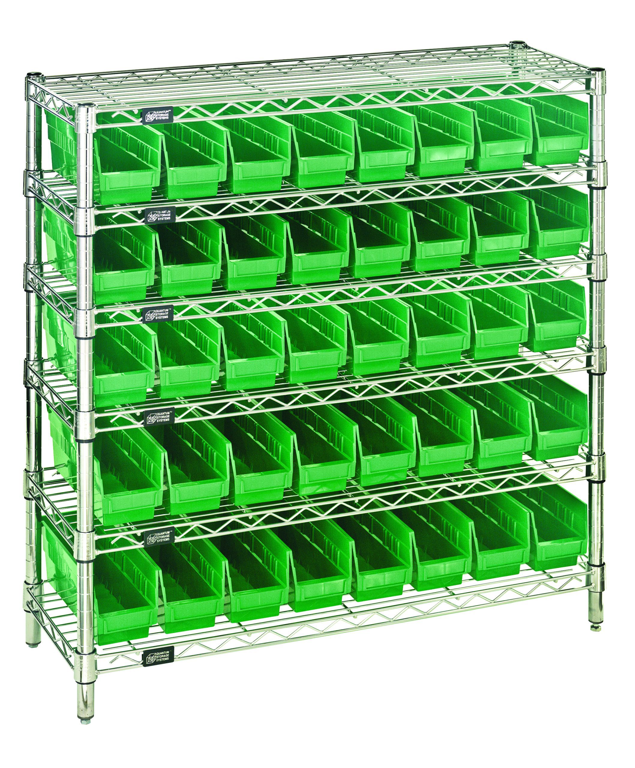 Bin Wire Shelving System, 36″W x 12″D x 36″H overall size, 800 lb. capacity per shelf, includes: (6) wire shelves, (4) posts, (40) QSB101 green bins, chrome plated finish