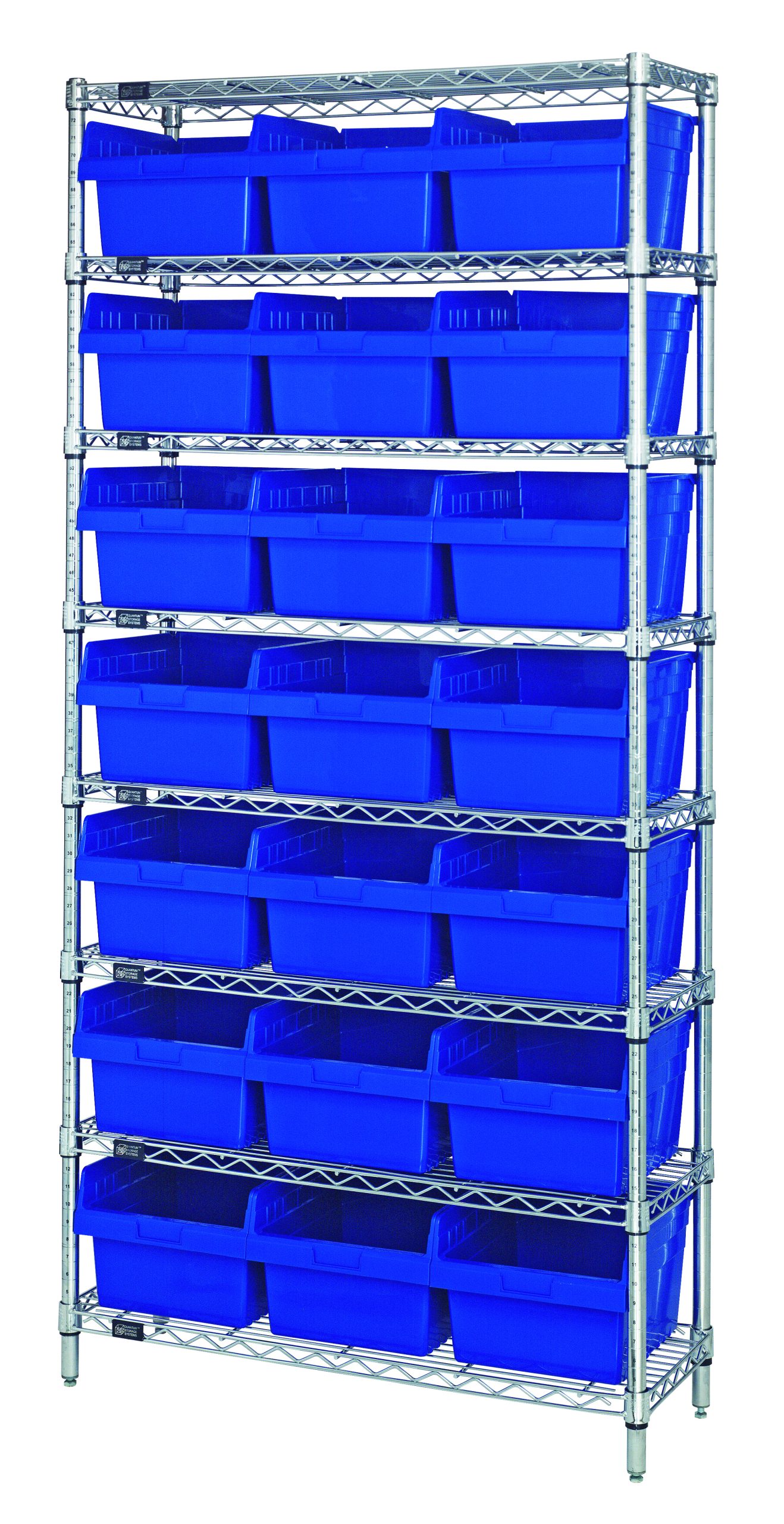 Quantum Bin Wire Shelving System, 36″W X 12″D X 74″H Overall Size, 800 Lb. Capacity Per Shelf, Includes: (8) Wire Shelves, (4) Posts, And (21) Qsb809 Blue Bins, Chrome Plated Finish