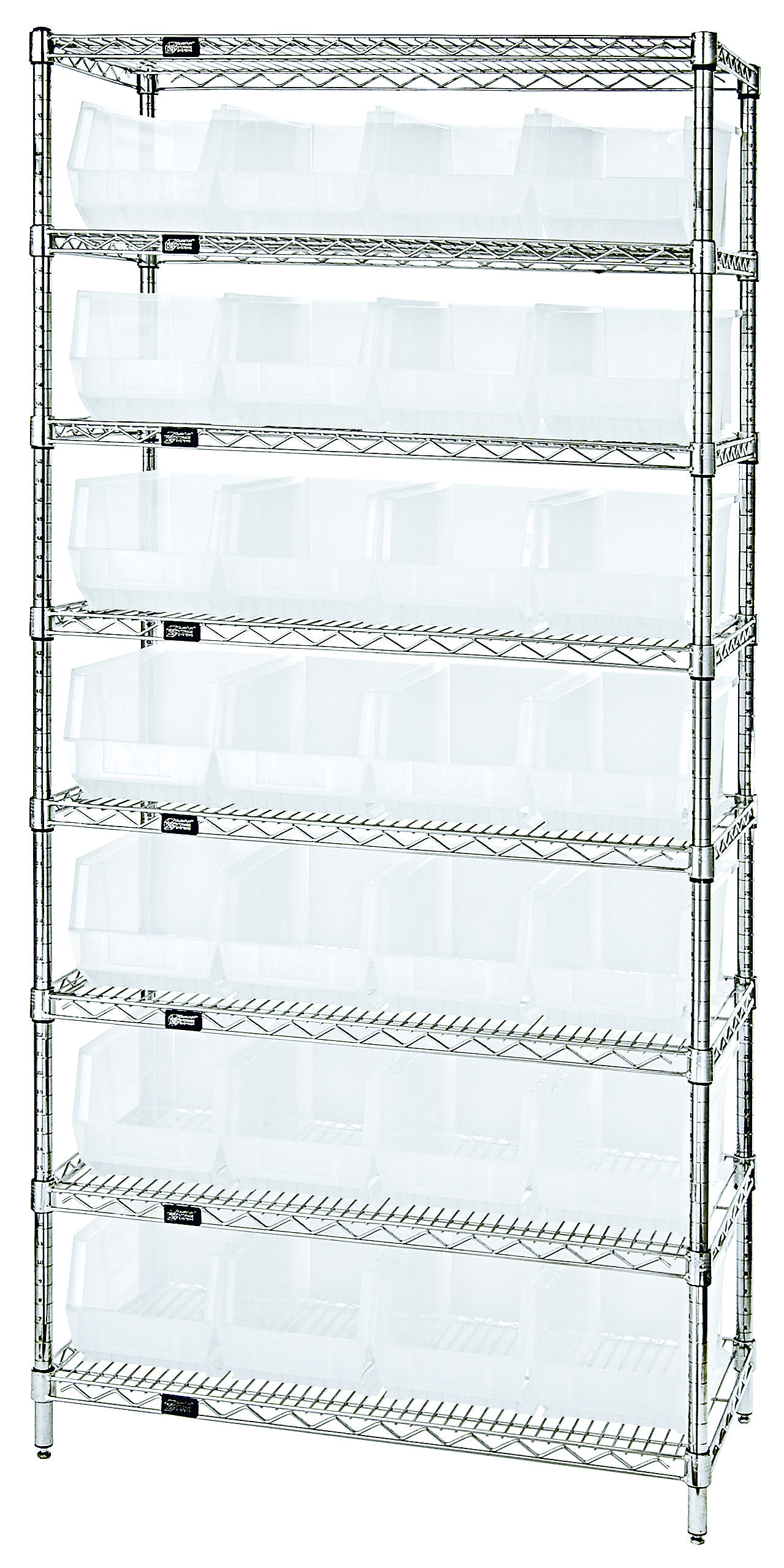 Bin Wire Shelving System, 36″W x 14″D x 74″H, 800 lbs load capacity per shelf, includes: (8) shelves and (28) QUS240 clear bins, chrome plated finish, shipped KD