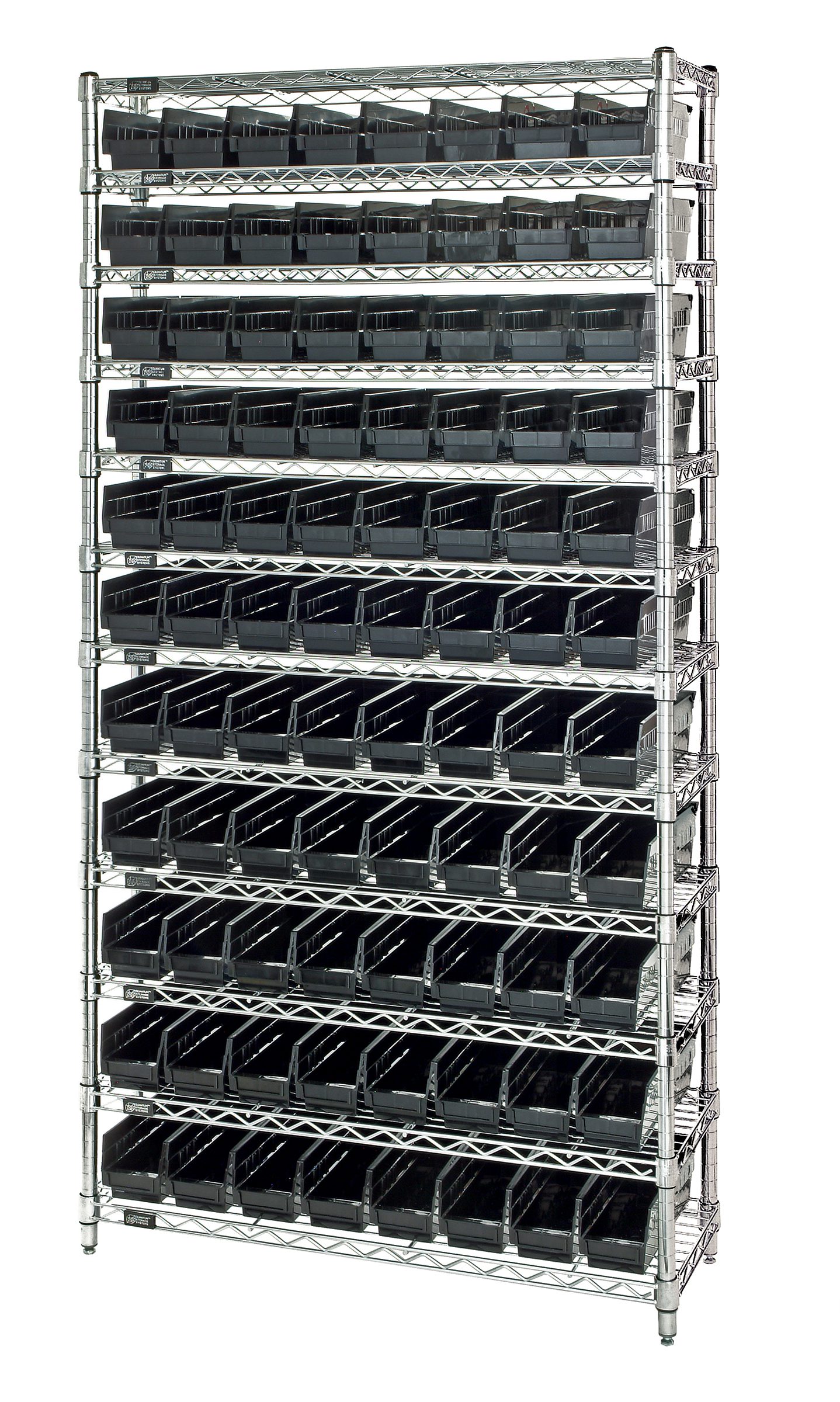 Bin Wire Shelving System, 36″W x 18″D x 74″H overall size, 800 lb. capacity per shelf, includes: (12) wire shelves, (4) posts, and (88) QSB103 black bins, chrome plated finish
