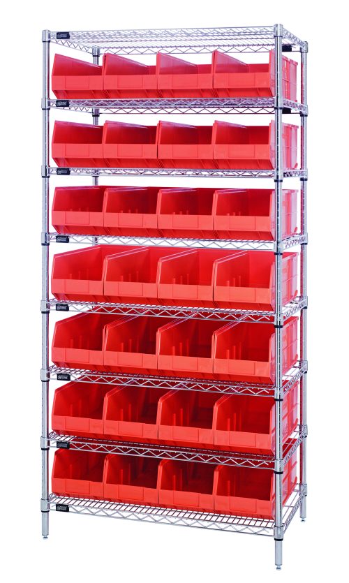 Quantum Bin Wire Shelving System, 36″W X 21″D X 74″H, 800 Lbs Load Capacity Per Shelf, Includes: (8) Shelves And (28) Ssb483 Orange Bins, Chrome Plated Finish, Shipped Kd