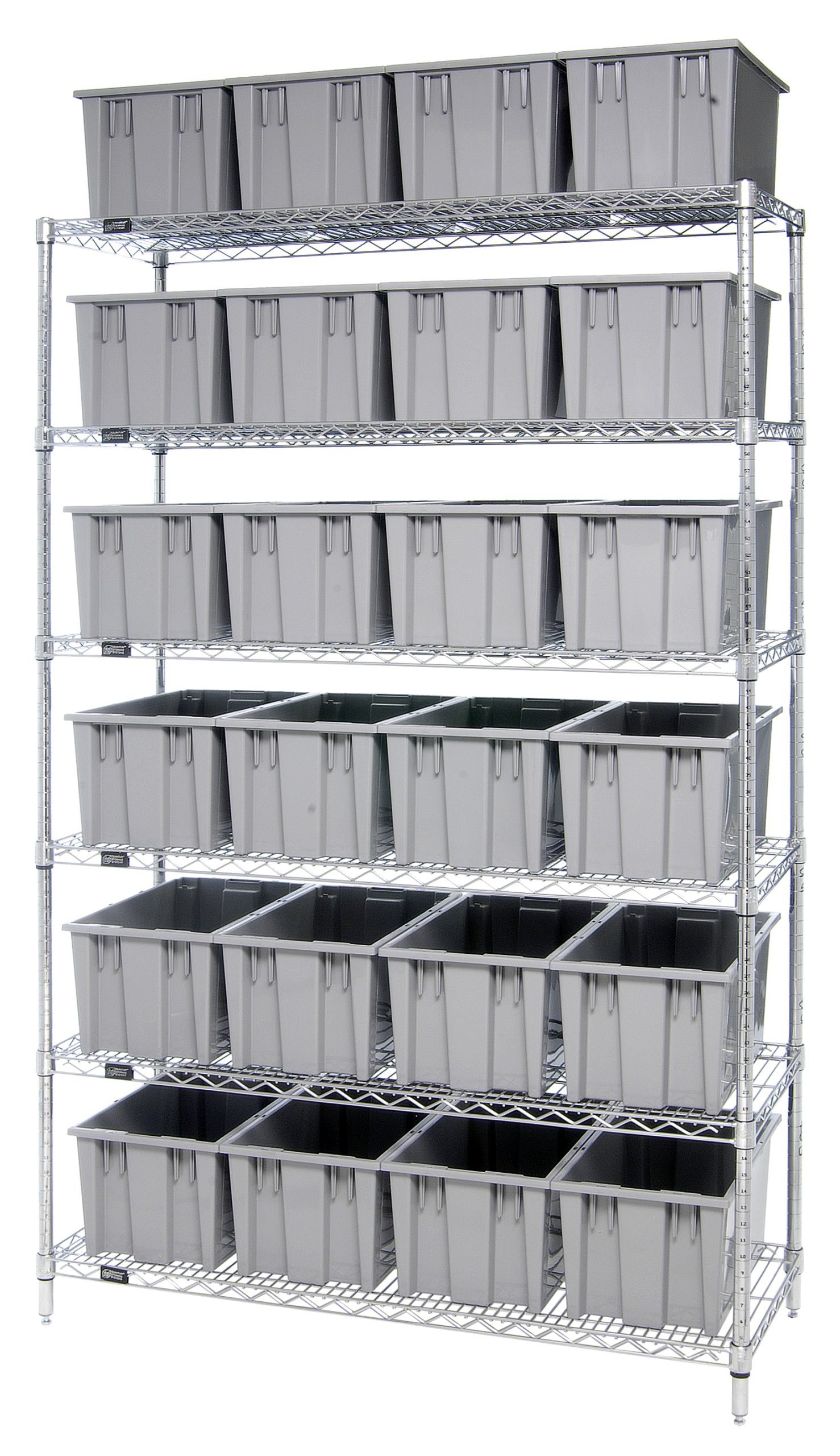 Quantum Bin Wire Shelving System, 48″L X 18″D X 74″H, 800 Lbs Load Capacity Per Shelf, Includes: (6) Shelves And (24) Snt185 Gray Containers, Chrome Plated Finish, Shipped Kd