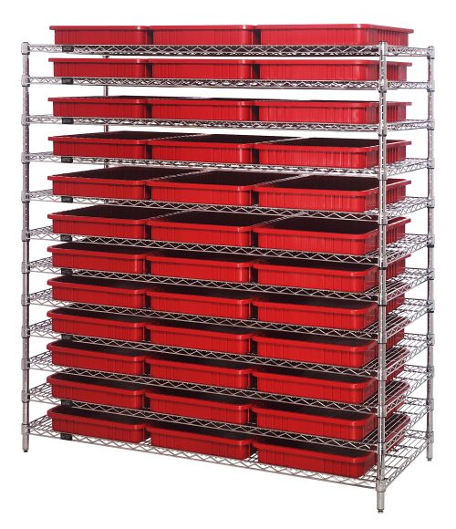 Bin Wire Shelving System, 60″L x 24″D x 63″H, 800 lbs load capacity per shelf, includes: (12) shelves and (36) DG93030 red containers, chrome plated finish, shipped KD