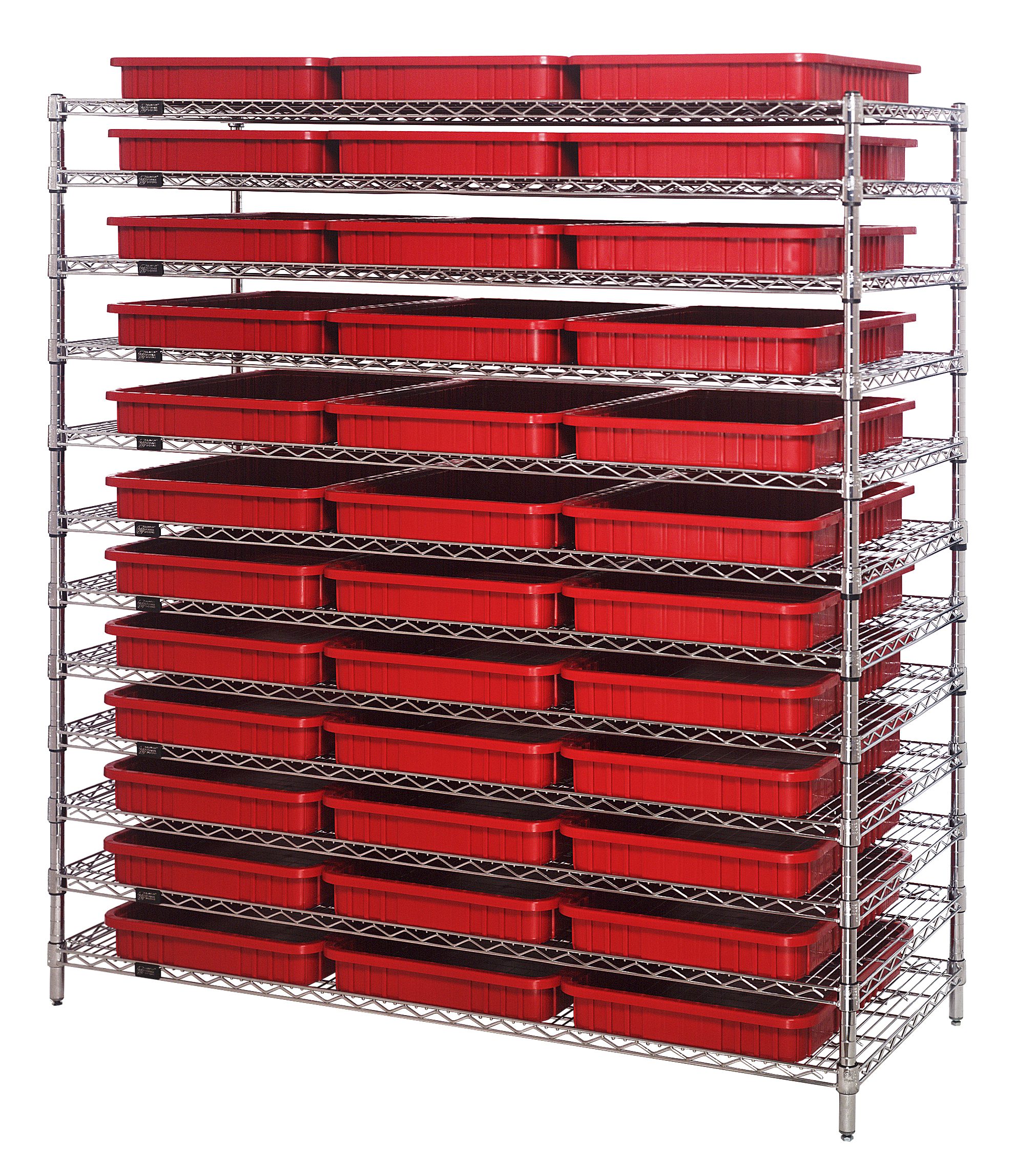 Quantum Bin Wire Shelving System, 60″L X 24″D X 63″H, 800 Lbs Load Capacity Per Shelf, Includes: (12) Shelves And (36) DG93030 Red Containers, Chrome Plated Finish, Shipped Kd