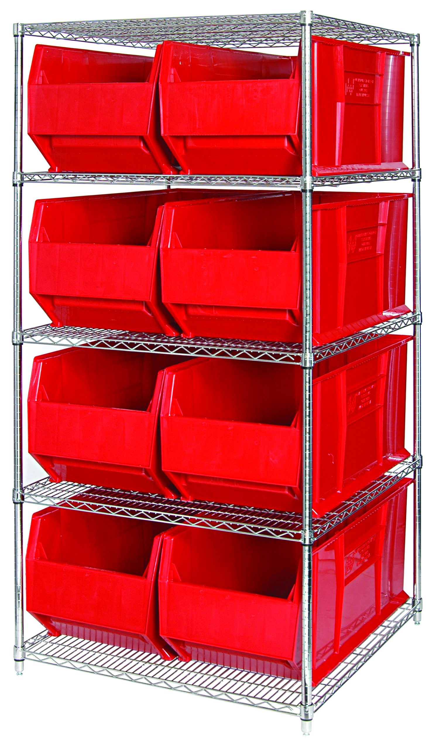 Quantum Bin Wire Shelving System, 60″W X 36″D X 74″H, 600 Lbs Load Capacity Per Shelf, Includes: (5) Shelves And (8) QUS993 Red Bins, Chrome Plated Finish, Shipped Kd