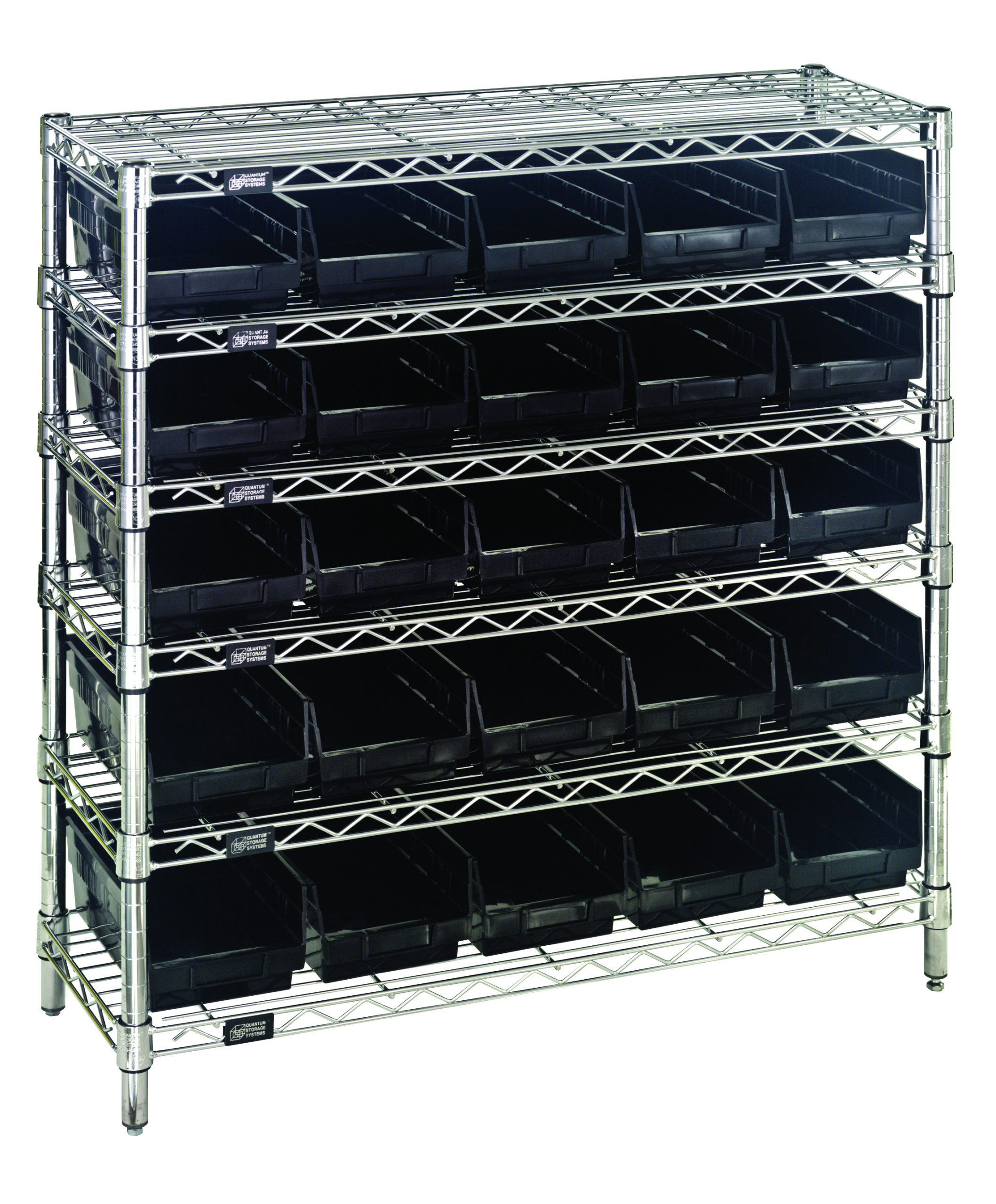 Bin Wire Shelving System, conductive, 36″W x 12″D x 36″H overall size, 800 lb. capacity per shelf, includes: (6) wire shelves, (4) posts, (25) QSB102 clear bins, chrome plated finish