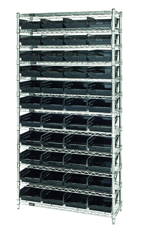 Bin Wire Shelving System, conductive, 36″W x 12″D x 74″H overall size, 800 lb. capacity per shelf, includes: (12) wire shelves, (4) posts, and (44) QSB107 bins, available in multiple color, chrome plated finish